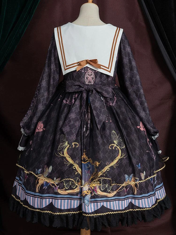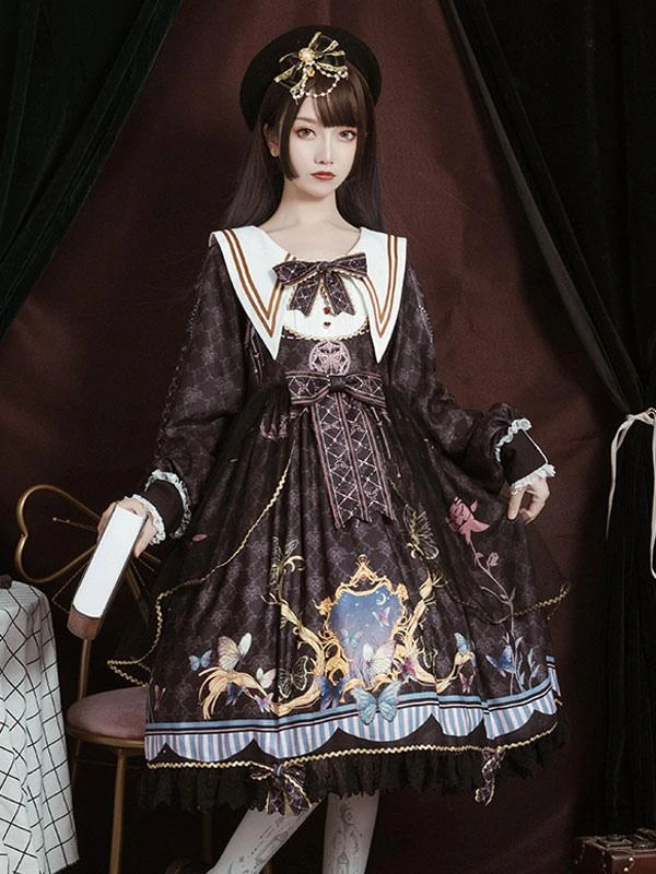 Gothic Lolita OP Dress Long Sleeve Bows Floral Print Pattern Cotton Black Lolita One Piece Dress
