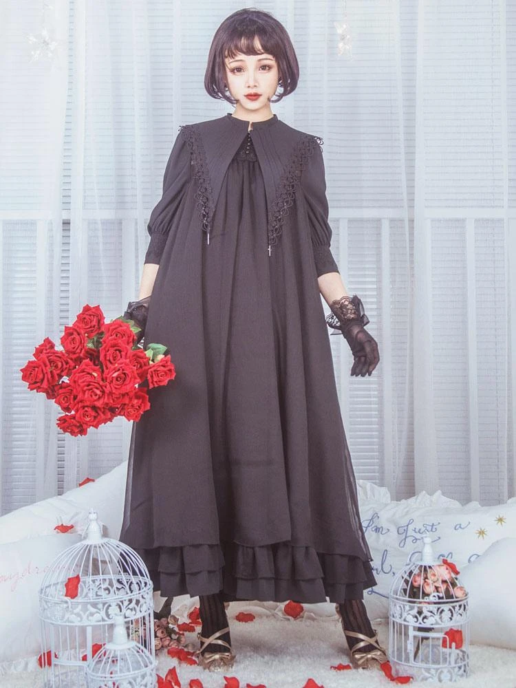 Military Style Lolita OP Dress 3 Pieces Set Black Long Sleeves Polyester Lolita Dress Outfit