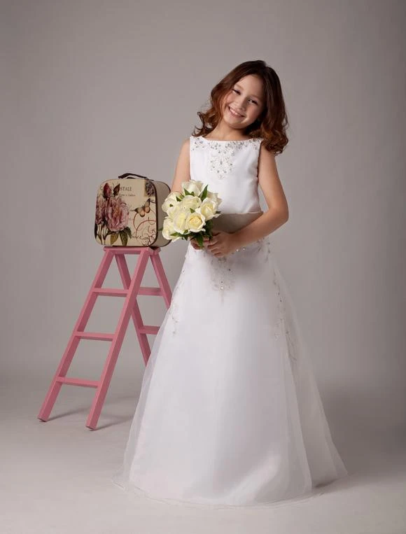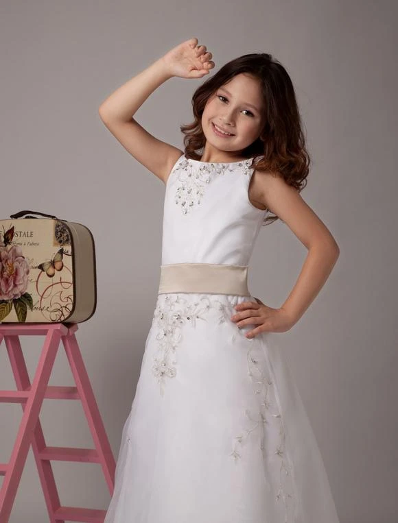 Do you want your little girl looks more attractive? This beautiful white a-line sleeveless satin organza flower girl dress can completely meet your requirements. White represents pureness which makes your little girl looks like a princess. The dress is special for its jewel neckline and empire waist silhouette which add adorable and loveliness. With this wonderful white a-line sleeveless sash satin flower girl dress, your little girl will become the shinning star when she walks on the road. Come on! It’s the perfect for her.