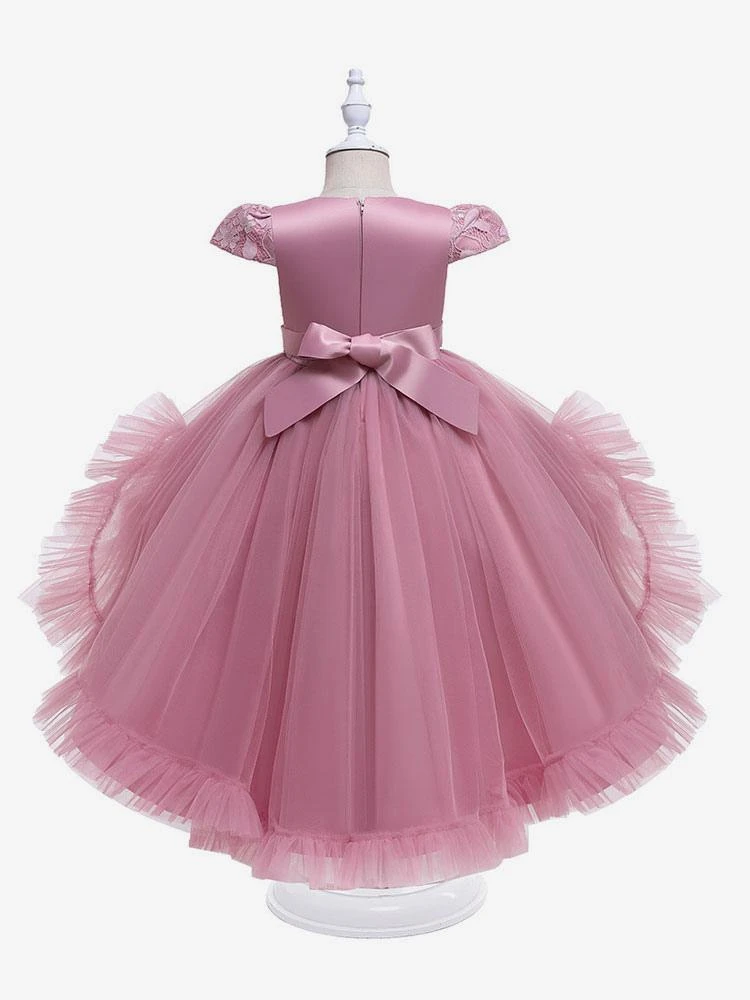 Satin Flower Girl’s Dress Ball Gown Illusion Neck Short Sleeves Girl’s Princess Formal Dress