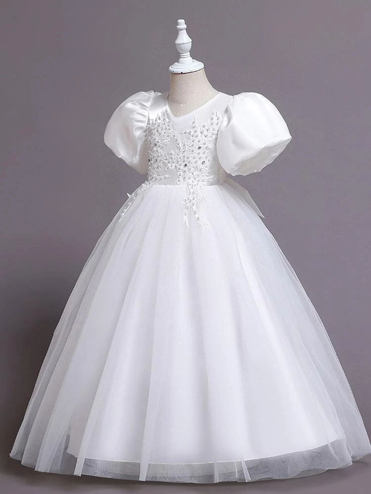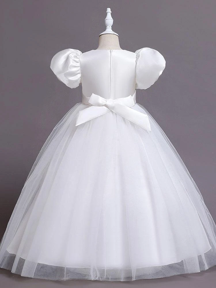 Satin Flower Girl’s Dress Ball Gown Illusion Neck Short Sleeves Girl’s Princess Formal Dress