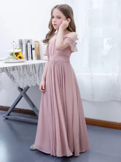 Cameo Pink Flower Girl Dress Chiffon Pleated Off-The-Shoulder Sleeveless Kids Birthday Party Dresses