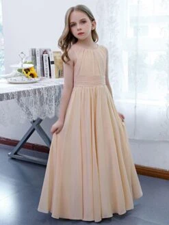 Champagne Flower Girl Dress Chiffon Pleated Jewel Neck Sleeveless Kids Birthday Party Dresses