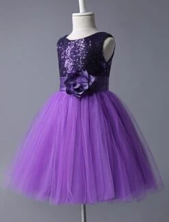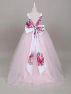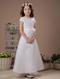 Satin Flower Girl’s Dress Ball Gown Illusion Neck Short Sleeves Girl’s Princess Formal Dress