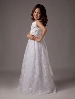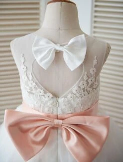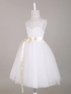 White Flower Girl Dress Princess Satin Bow Lace Sleeveless Tulle Tea-Length Pageant Dress