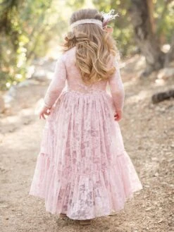Flower Girl Wedding Dress Lace Pink Round Neck Long Sleeve Ankle Length Kids Party Dresses