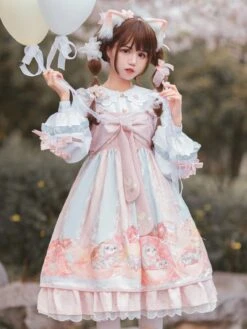 JSK Sweet Lolita Dress Tea Party High Waist Cat Print Bows Sleeveless Lolita JSK Dress