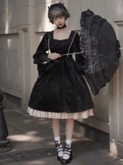 Lolita Dress 2-Piece Set Polyester Accessory Long Sleeves Ruffles Black Lolita Jumper Skirt