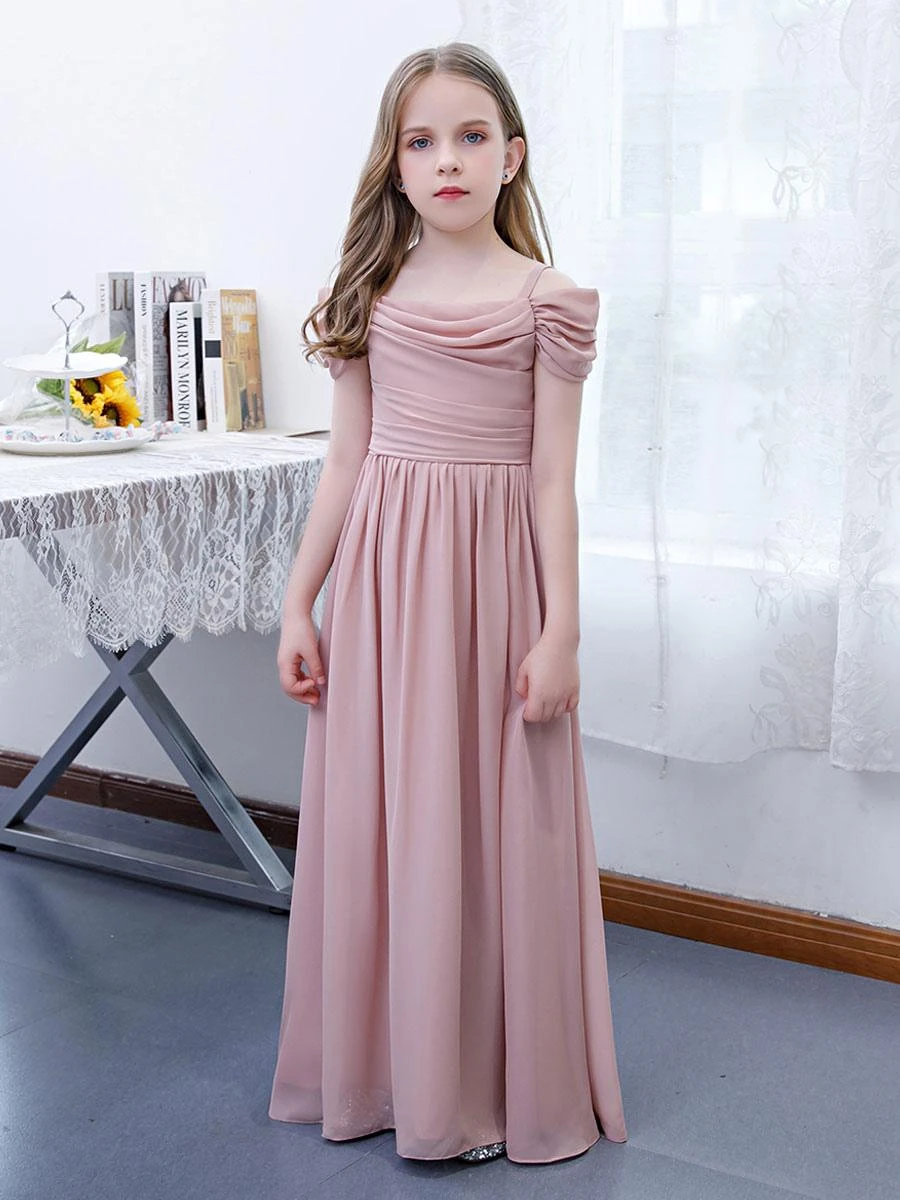 Cameo Pink Flower Girl Dress Chiffon Pleated Off-The-Shoulder Sleeveless Kids Birthday Party Dresses