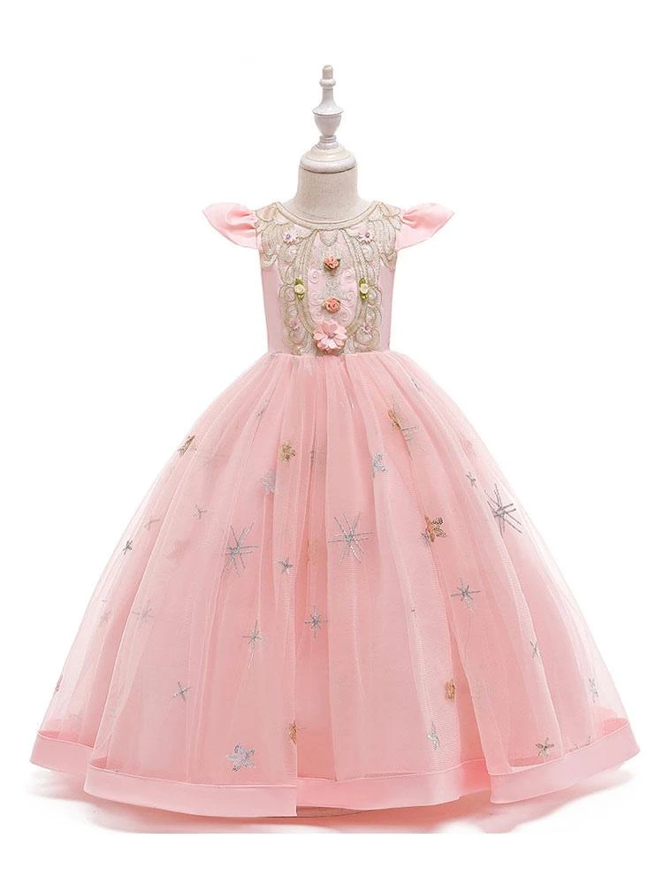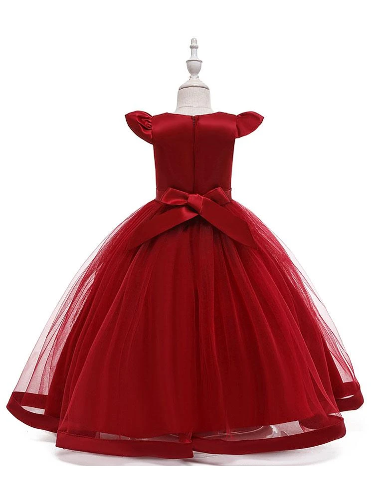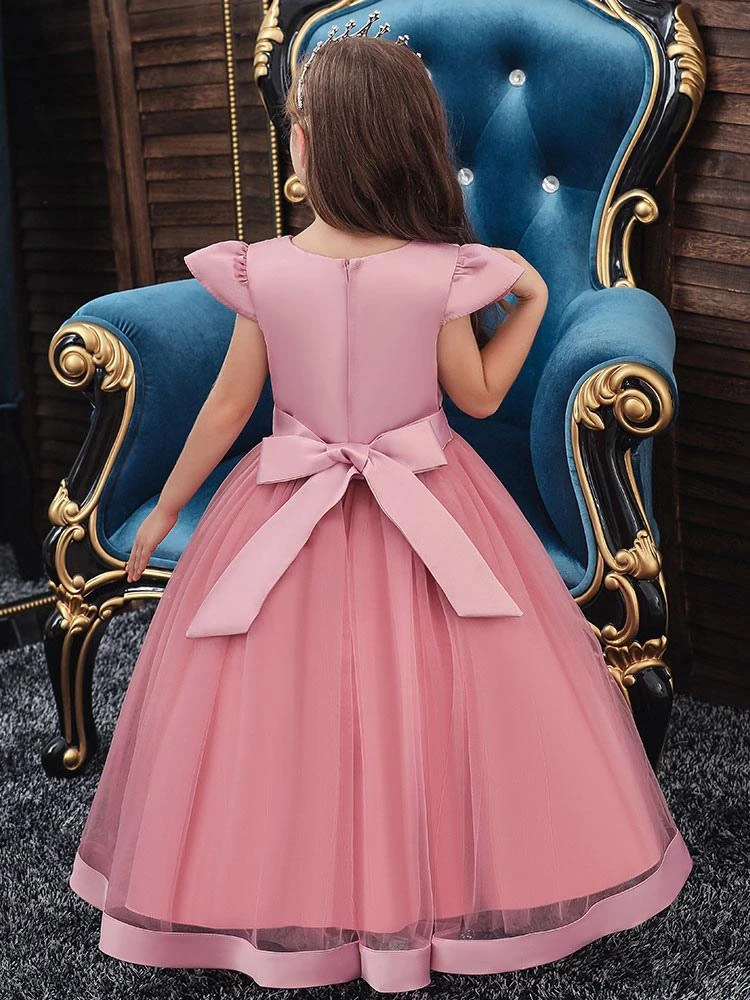 Satin Flower Girl’s Dress Ball Gown Illusion Neck Short Sleeves Girl’s Princess Formal Dress