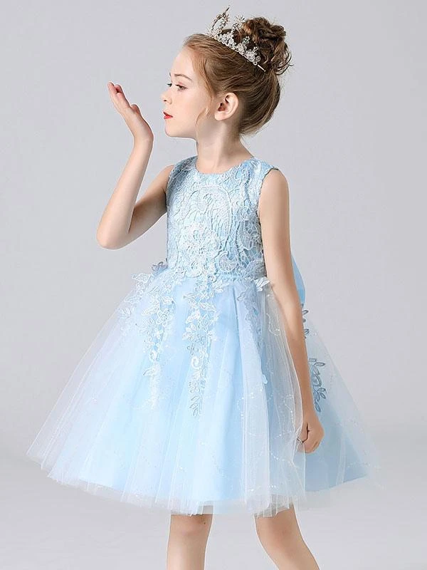 Blue Flower Girl Dresses Jewel Neck Sleeveless Short Princess Dress Sash Lace Kids Party Dresses
