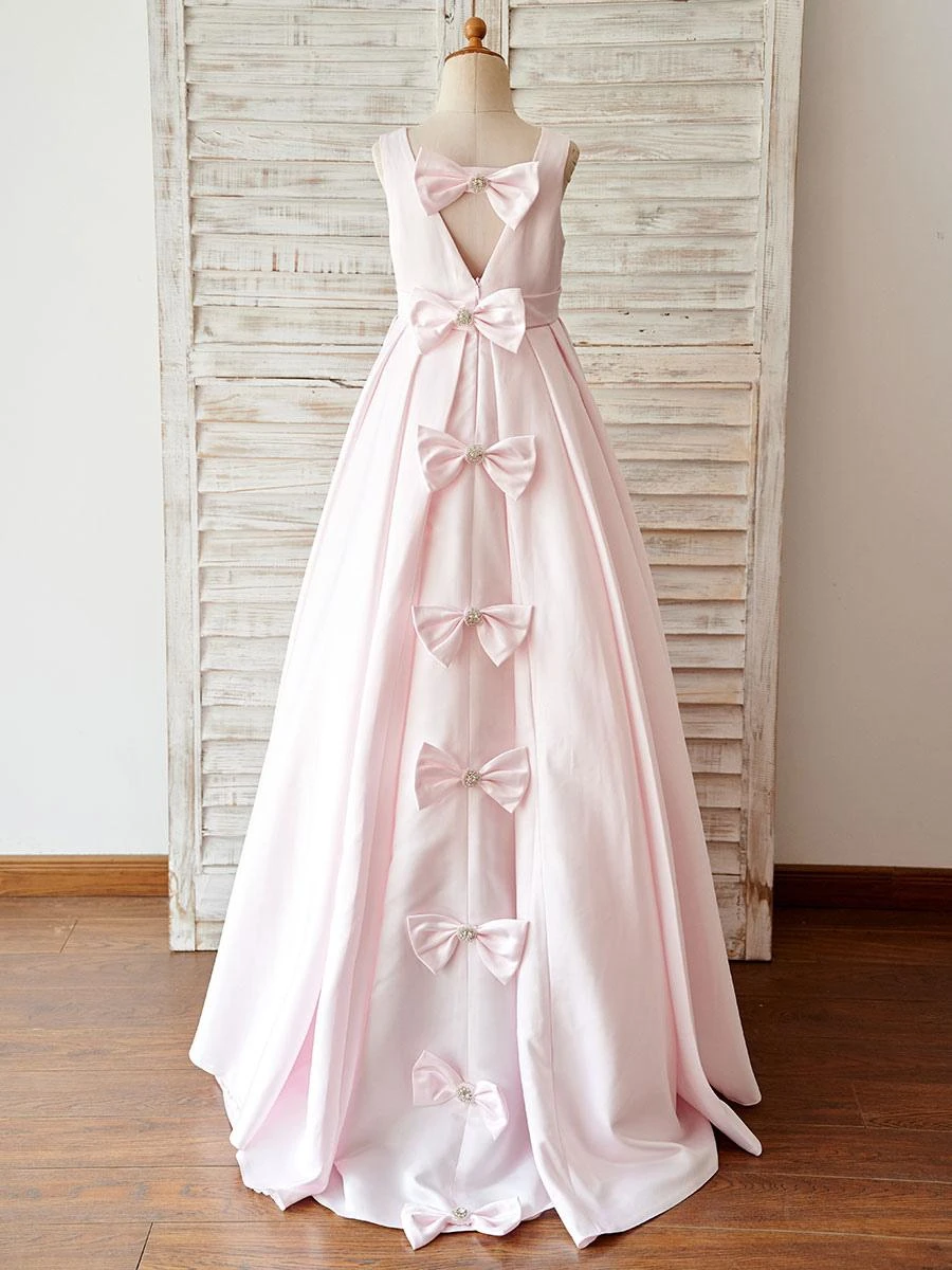 Be the first to review “Pink Satin V Back Wedding Flower Girl Dress With Bows” Cancel reply