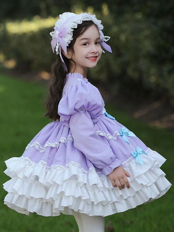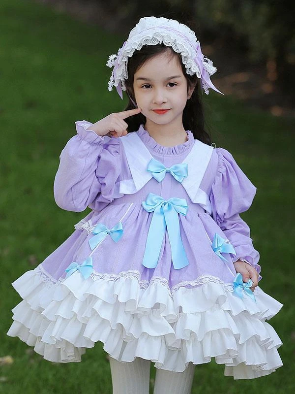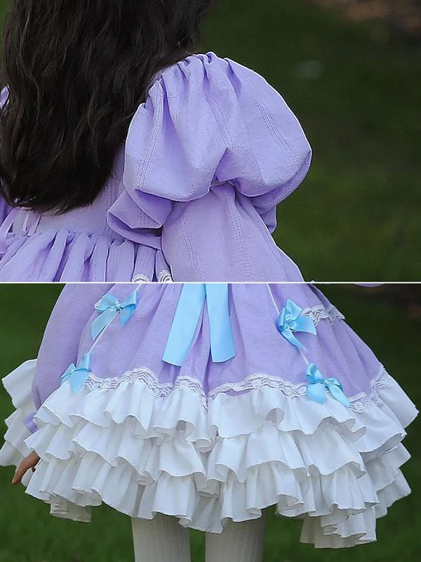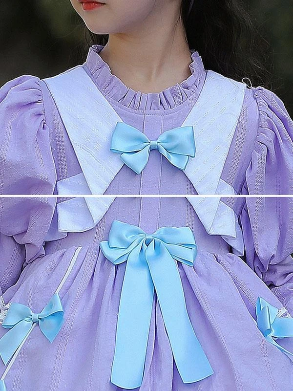 Children’s Sweet Lolita Dress Violet Blue Bows Polyester Short Sleeve Kids Princess One Piece Dress