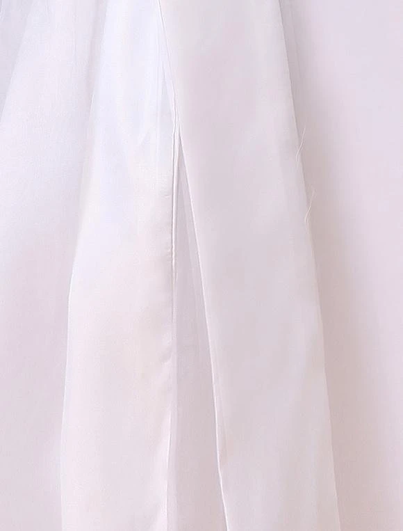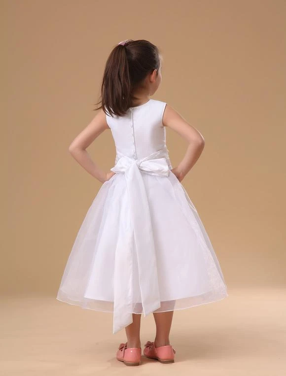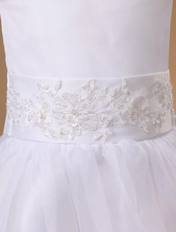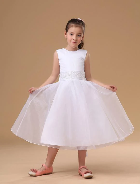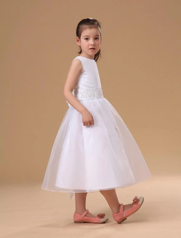 This darling little flower girl dress will have the flower girl in your wedding party looking like a miniature bride! It features a pretty sleeveless bodice with a rounded neckline and row of fabric covered buttons for a closure in the back. The midsection of the dress is embellished with an embroidered waistband that ties in a lovey bow in the back of the dress. The A-line skirt is full and shapely, thanks to many layers of tulle-like fabric. A gorgeous dress for a gorgeous girl!
