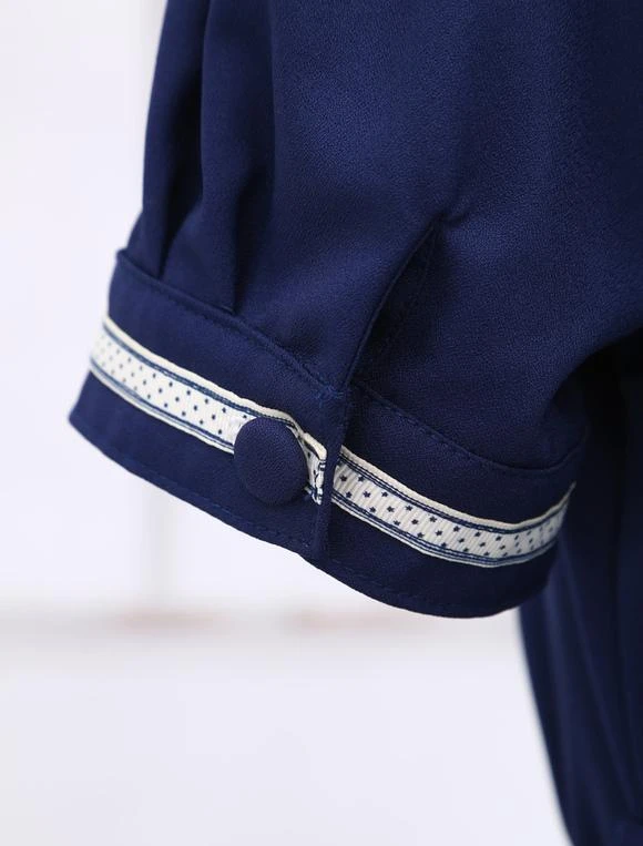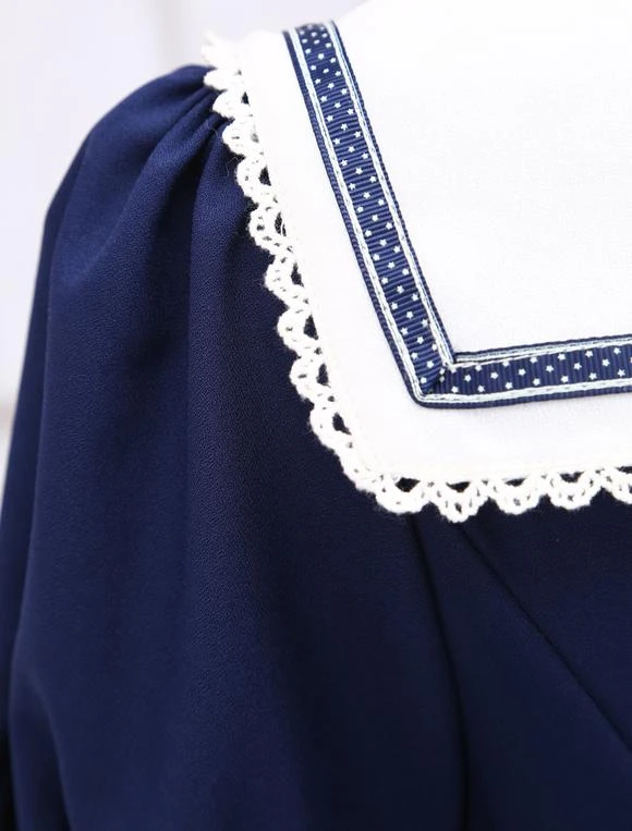 This sweet lolita dress features sailor collar with cute bow embellishment in front. Back lace up design and elastic waist makes sure the dress is suitable for any body type. Romantic ruffles on hemline adds feminine appeal.