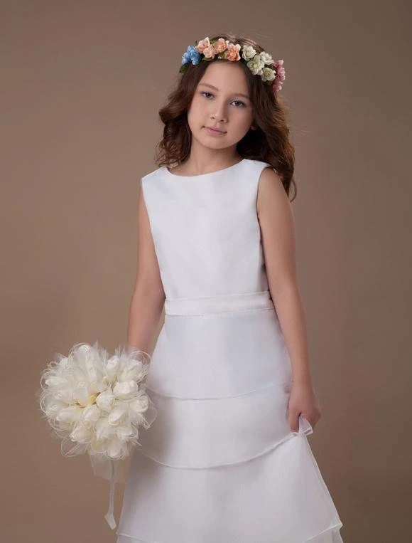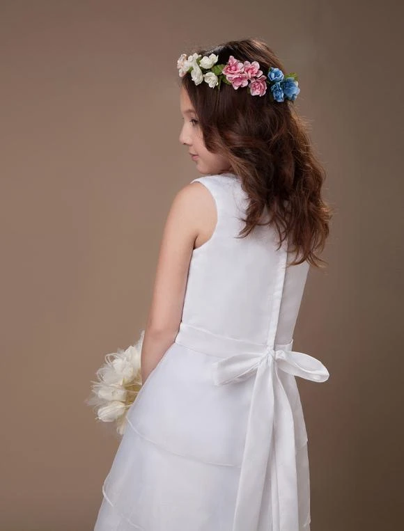 First Communion dresses are meant to be memorable – just like the service itself. This one is sure to be. It features a rounded neckline, wide straps and a ribbon waistband that ties in a pretty bow in the back. The skirt is long and made from multi-tiers of fabric that add fullness and lots in detail. The hem of the dress is slightly asymmetrical, with the back being longer than the front. A lovely gown for any little girl’s First Communion.
