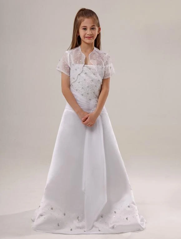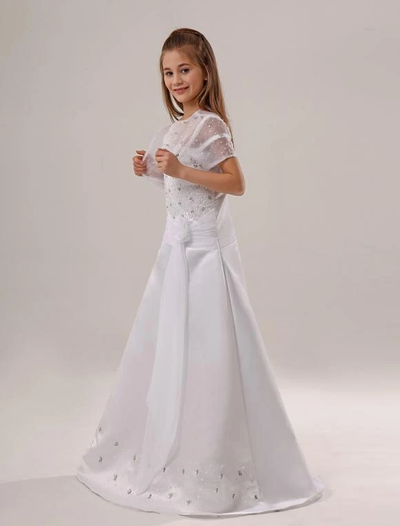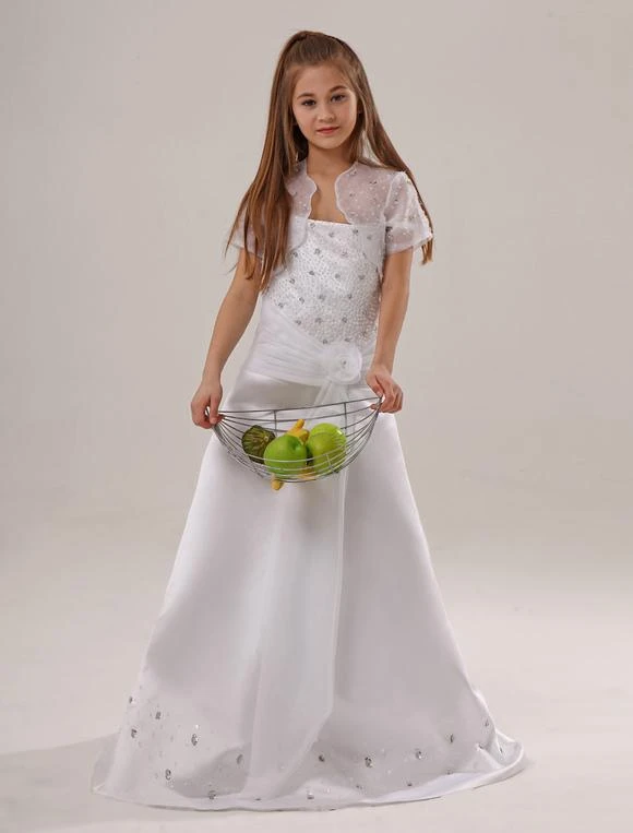 This kind of flower girl dress features its beaded bodice and skirt,sash flower decorated on the waist,a short sleeves waistcoat is included.This dress is available in other colors shown on the color card,and available from size 2 to size 14.Please select the color,and if you don’t,the one shown on the picture will be your choice.We also offer a made-to-measurement service if you need.